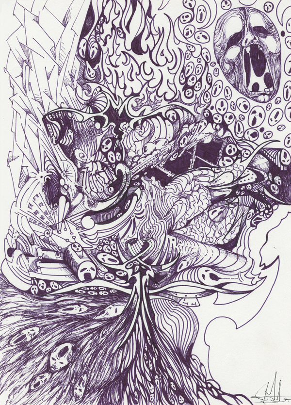 “A Thousand Screams” Pen and Ink on Paper 9″ x 12″ Ideas: No, there are not actually 1,000 screaming faces in this drawing. The concept is figurative, a...