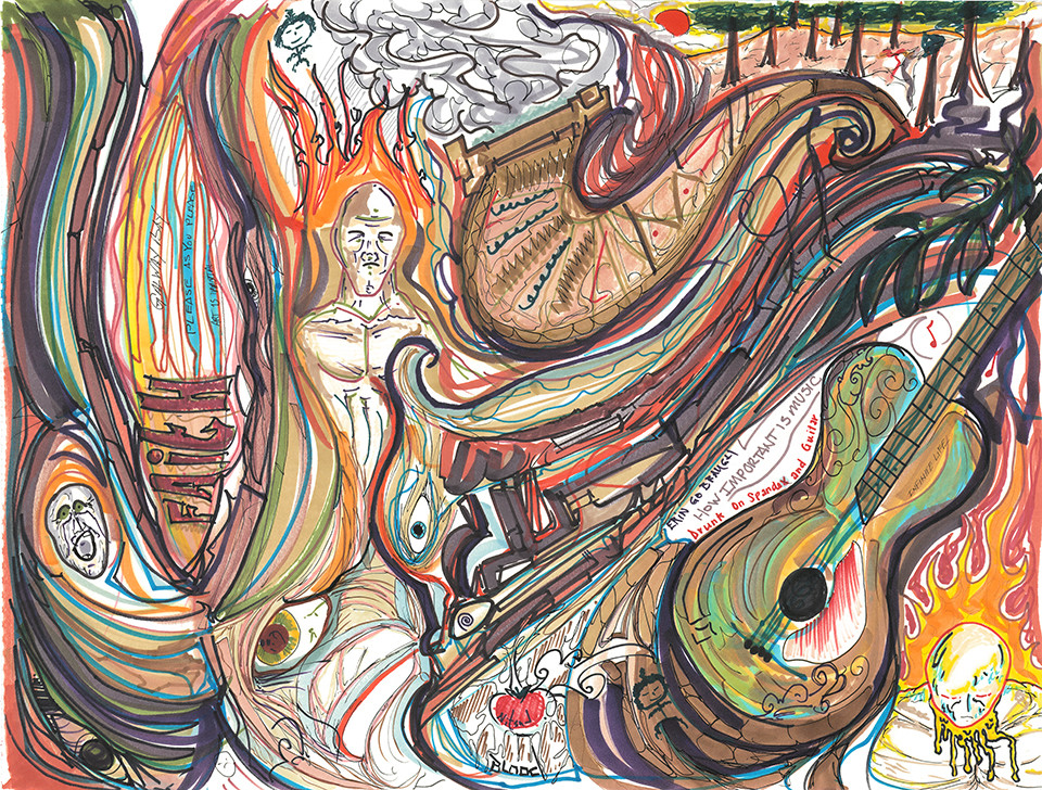 In 2009 I began having collaborative drawing projects take place at my command center on the North Side of Chicago. Any and all were welcome barring the following conditions: If you walk in, you must participate. If you walk in, you must respect my home. If you walk in you cannot say, “I can’t even draw a stick figure”, because that is a lie. These collaborations are about joining in a world many think foreign, but they’ve only forgotten. These projects serve to wake up the expressions and thoughts people hold back out of fear, or embarrassment, or both. The time spent creating with others is pure and honest creativity. At the end of each night, I will refine areas by inking them but then the piece is not touched again. It was a beautiful happening, there are no mistakes. No incorrect participation. The pieces live as moments in time where people came together to create something wild, or intense, or whimsical, but ultimately pure and beautiful. These pieces do not belong to me, they belong to all. Thus, any sales of prints of these collaborative artworks is donated completely to the charity I am very active with, The National Multiple Sclerosis Society. Each print sold helps bring us closer to a world free of MS.